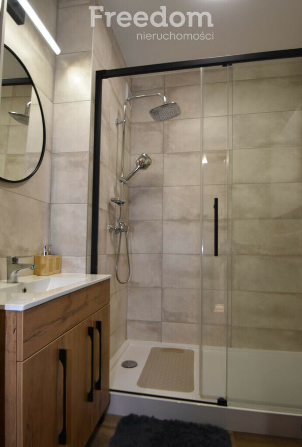 -łazienka wyposażona w kabinę prysznicową, umywalkę, meble